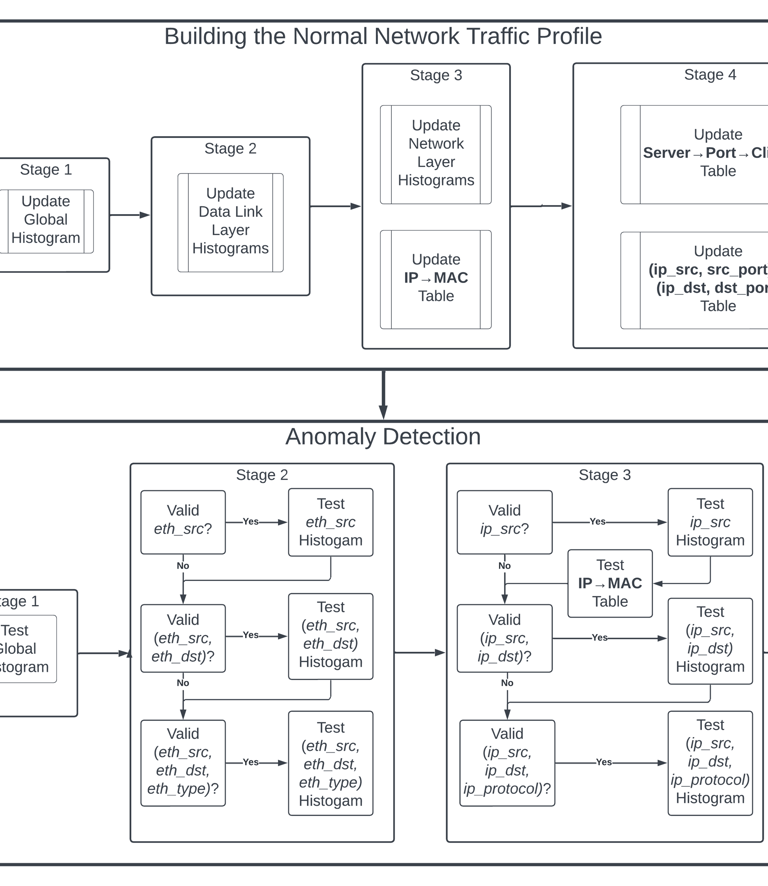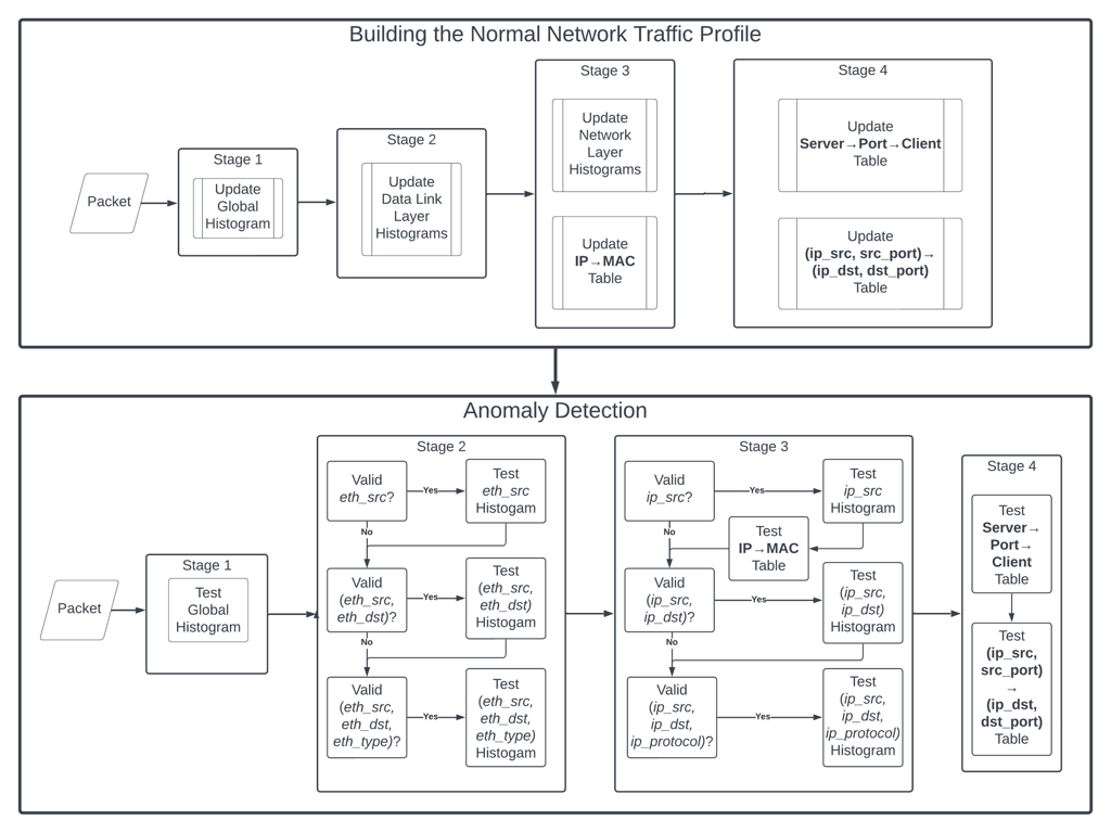 Our two-stage anomaly detection strategy employs heuristics and the byte histogram data structure to detect malicious activity as packets enter the network. The novelty of our byte histogram data structure is the ability to detect anomalies in packets where the details of every protocol in the packet are unknown.
